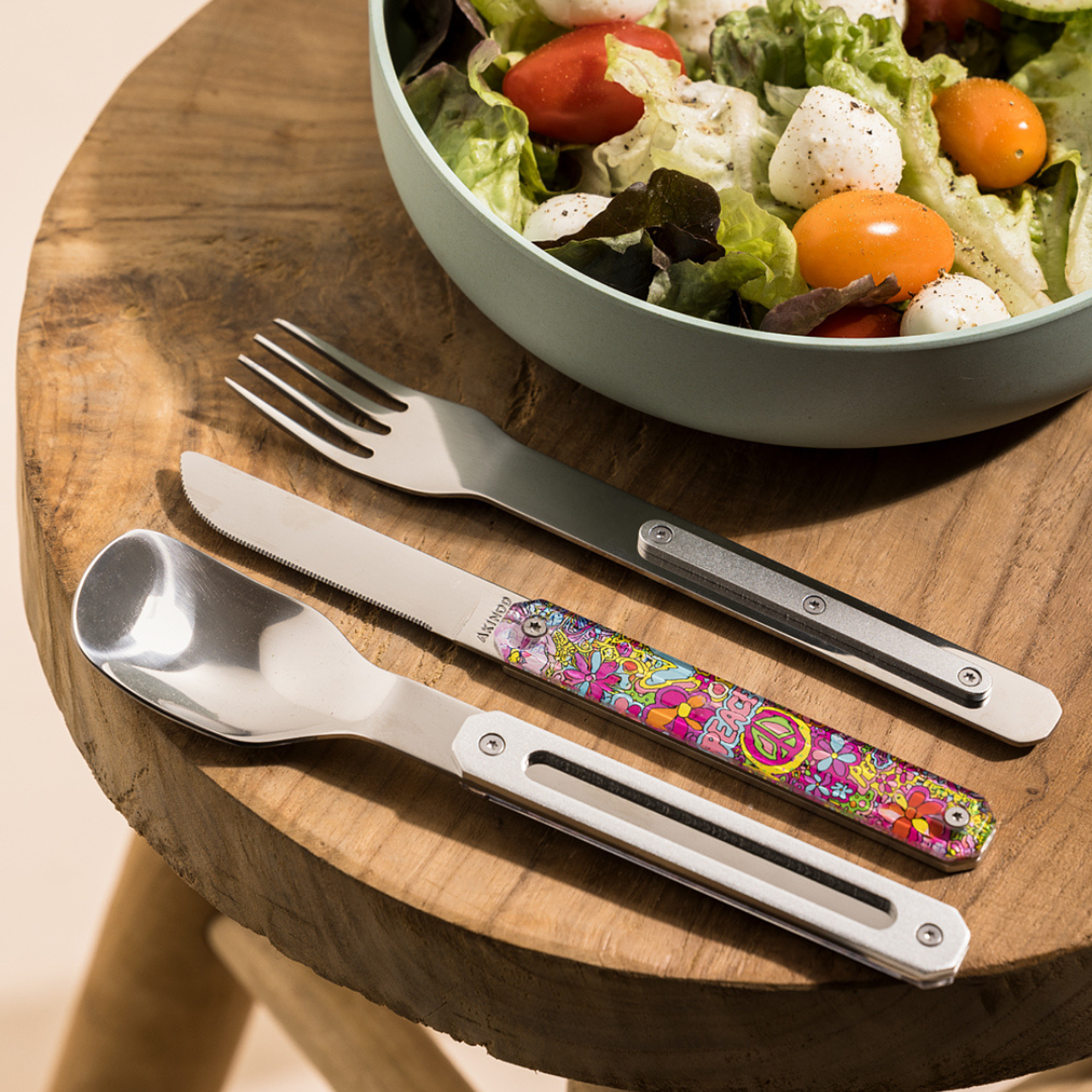 Mangez n'importe où mais pas n'importe comment! Akinod, marque française, souhaite égayer votre pause déjeuner avec les couverts nomades, fiables et robustes.