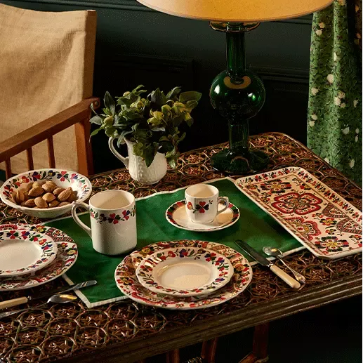 Pour une table encore plus raffinée, associez Chance Folle aux assiettes Filet Rouge ou Filet Cobalt : leurs teintes élégantes souligneront à la perfection l’originalité et le charme singulier de cette création signée Nathalie Farman-Farma.